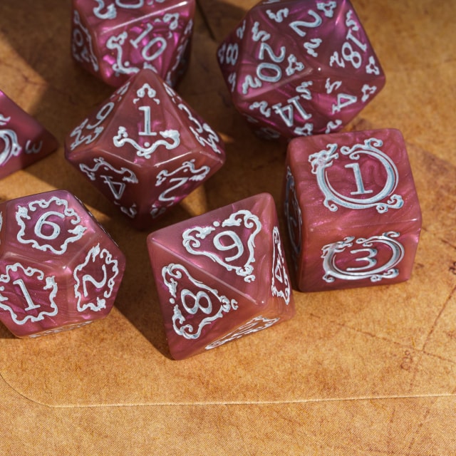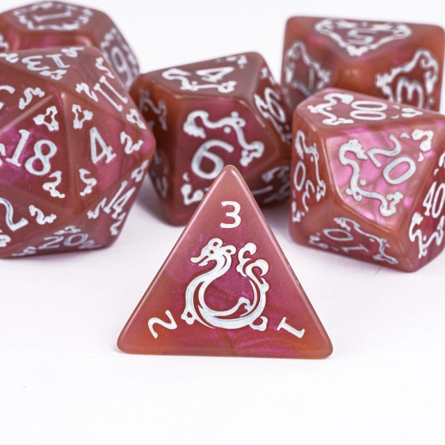 Kauliukai yra pagaminti iš rausvos spalvos blizgaus akrilo, bei papuošti aukso spalvos skaičiais, drakonas, bei įvairiais raštais. Tai jiems suteikia išskirtinį ir stilingą įvaizdį, dėl to kauliukai puikiai atrodo juos ridenant žaidimo metu.