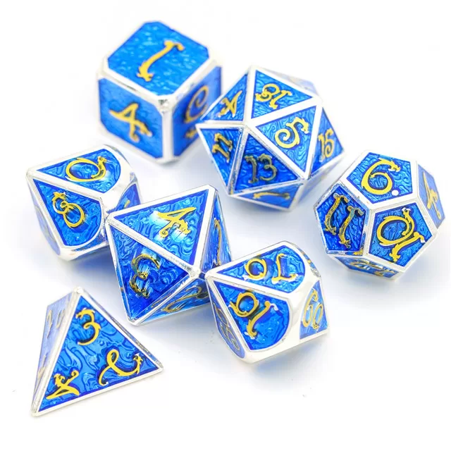 Kauliukai yra pagaminti iš metalo lydinio. Kauliukų kraštinės sidabro spalvos, fonas – mėlynas it giedras dangus, kuriame aukso spalvos skaičiai it skraidantys drakonai. Šis rinkinys yra idealus pasirinkimas žaidėjams, kurie vertina stilingą dizainą ir ilgaamžiškumą.