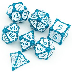 Kauliukai yra pagaminti iš metalo lydinio, lieti taip, kad skaičiai atrodo lyg durklai. Kauliukų fonas – baltos it sniegas spalvos, o kraštinės, bei skaičiai, padabinti it ledas, žalsvai mėlyna spalva, kuri padada jiems išsiskirti ir būti puikiai įksiatomais. Šis rinkinys yra idealus pasirinkimas žaidėjams, kurie vertina stilingą dizainą ir ilgaamžiškumą.