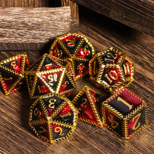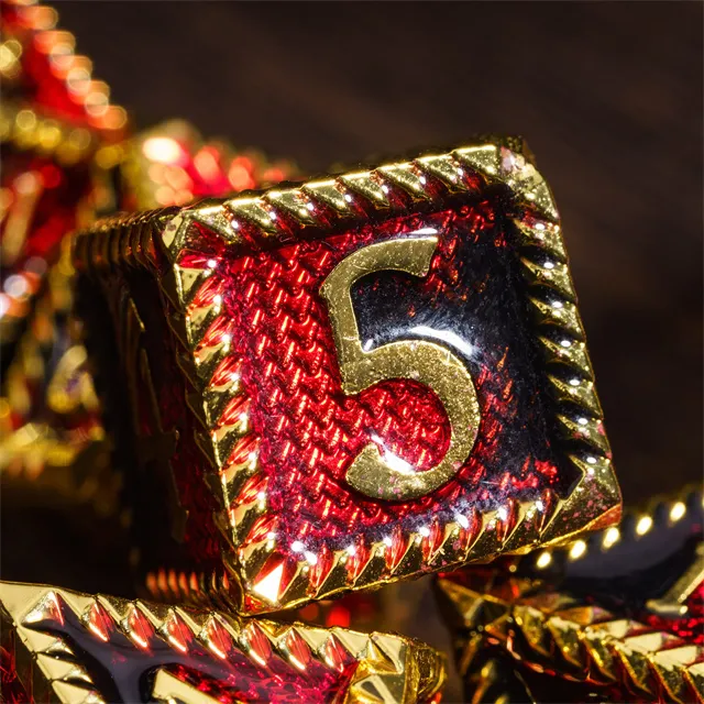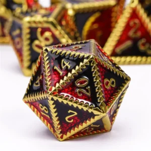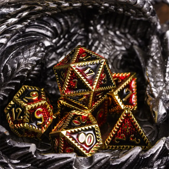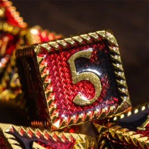 The dice are made of a metal alloy resembling red scales gold. The simplicity of the colour of the dice gives them a luxurious and at the same time distinctive look. All dice are decorated with draconian numbers! This set is the ideal choice for players who appreciate stylish design and durability.