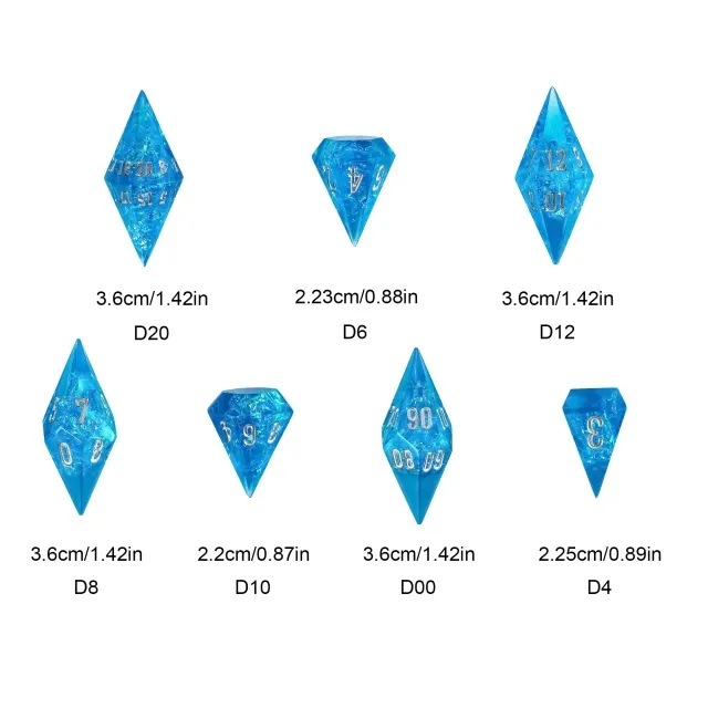 Tai yra 7 vienetų kauliukų deimantų formos rinkinys, skirtas tokiems RPG žaidimams, kaip D&D (Dungeons and Dragons), Pathfinder, Cyberpunk 2077, Call of Cthulhu ir kt.
