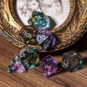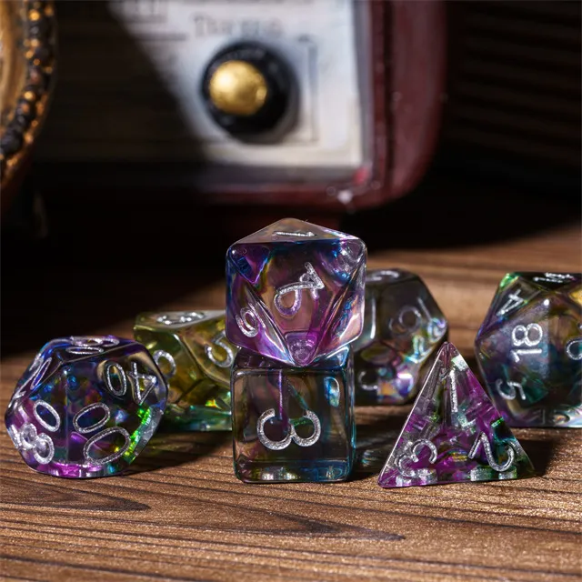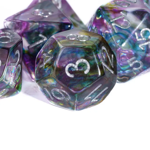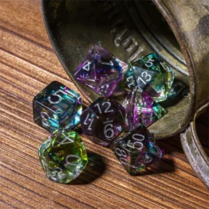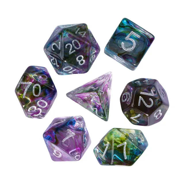 Kauliukai yra pagaminti iš permatomo resino, ir kiekviename iš jų viduje yra spalvų sprogimas. Šie kauliukai, dėl savo unikalios išvaizdos, nebejotinai išsiskirs iš kitų!