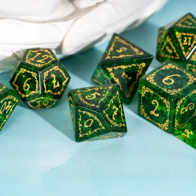 Kauliukai yra pagaminti iš permatomos maišytų tamsiu ir žaliu spalvų daužto stiklo, o kiekvieno iš jų viduje blizgantys it spalvoti ornamentai, kuri kurie primena it magiškus žybčiojimus jų viduje!