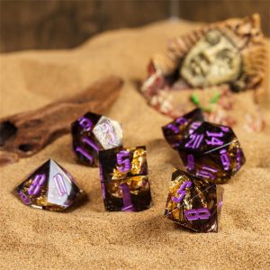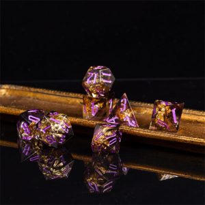 Kauliukai yra pagaminti iš violetinės spalvos resino, o kiekvieno iš jų vidus papuoštas aukso spalvos blizgia folija, Šis kauliukų rinkinys yra idealus pasirinkimas žaidėjams, kurie vertina stilingą dizainą ir ilgaamžiškumą.