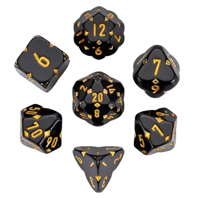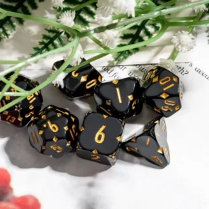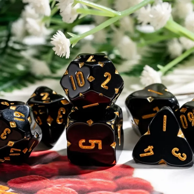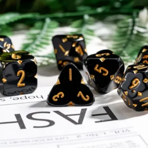 Kauliukai pagaminti iš juodos spalvos resino, todėl yra lengvi ir patvarūs. Visi padailinti tarsi sekmes dobilo imitacija. Taip pat rinkinyje esantys kauliukai papuošti auksines spalvos skaičiais. Visa tai, šiam kauliukų rinkiniui, suteikia magišką, modernų ir stilingą dizainą, kuris puikiai atrodo juos ridenant žaidimo metu.