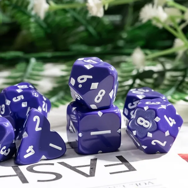 Kauliukai pagaminti iš purpurines spalvos resino, todėl yra lengvi ir patvarūs. Visi padailinti tarsi sekmes dobilo imitacija. Taip pat rinkinyje esantys kauliukai papuošti balta spalvos skaičiais. Visa tai, šiam kauliukų rinkiniui, suteikia magišką, modernų ir stilingą dizainą, kuris puikiai atrodo juos ridenant žaidimo metu.