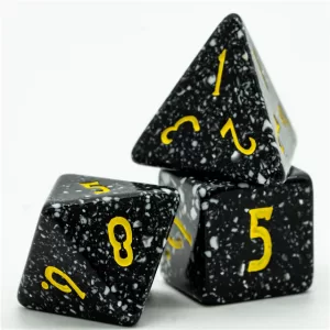 Kauliukai yra pagaminti iš juodos ir baltos spalvos resino. Kauliukų juodas fonas papuoštas baltomis dėmelėmis, ir kiekvienas iš kauliukų padabintas geltonos spalvos skaičiais. Visa tai, šiam kauliukų rinkiniui, suteikia modernų ir stilingą dizainą, kuris puikiai atrodo juos ridenant žaidimo metu.