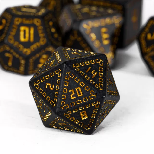 Kauliukai pagaminti iš juodos spalvos resino, todėl yra lengvi ir patvarūs. Taip pat kauliukų kampai atrodo lyg šiek tiek „nupjauti”, taip jiems suteikiama daugiau tekstūros. Visi rinkinyej esantys kauliukai padabinti aukso spalvos skaičiais ir prabangiais raštais aplink juos. Visa tai, šiam kauliukų rinkiniui, suteikia magišką, modernų ir stilingą dizainą, kuris puikiai atrodo juos ridenant žaidimo metu.