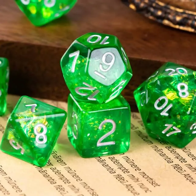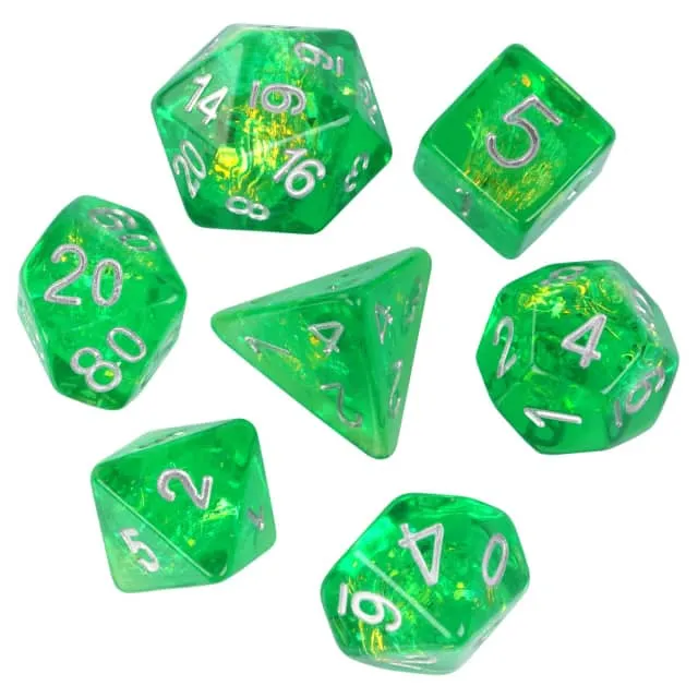 Kauliukai yra pagaminti iš permatomo resino, o kiekvieno iš jų viduje yra žalio saldainio mišinis, tad Jūsų kauliukai, žaidimo metu, tikrai išsiskirs iš likusiųjų!