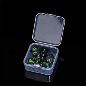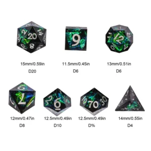 Kauliukai yra pagaminti iš permatomo resino, o kiekvieno iš jų viduje yra blizgaus juodo saldainio mišinis, tad Jūsų kauliukai, žaidimo metu, tikrai išsiskirs iš likusiųjų!