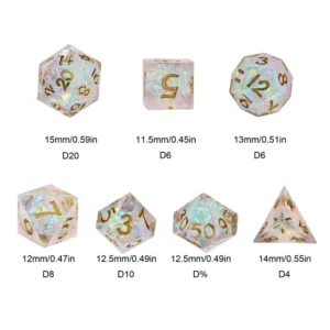 Kauliukai yra pagaminti iš permatomo resino, o kiekvieno iš jų viduje yra blizgaus saldainio mišinis, tad Jūsų kauliukai, žaidimo metu, tikrai išsiskirs iš likusiųjų!