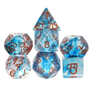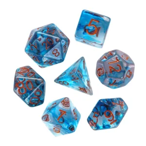 Kauliukai pagaminti skaidraus melsvo spalvos resino, todėl yra lengvi ir patvarūs. Kauliukų rinkynis yra modernus ir stilingas, tad kauliukai puikiai atrodo juos ridenant žaidimo metu.