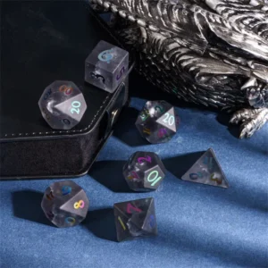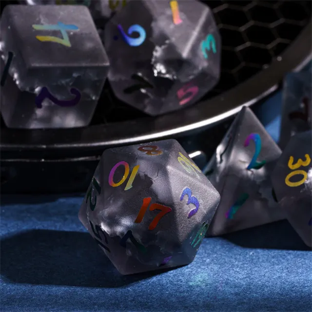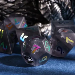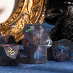 Kauliukai yra pagaminti iš matinio, juodo stiklo, o kiekvieno iš jų viduje, lazerių pagalba, suformuoti įtrūkimai, kurių dėka kauliukai patampa dar magiškesni! Taip pat kiekvienas kauliukas yra padabintas spalvotais, puikiai įskaitomais skaičiais.