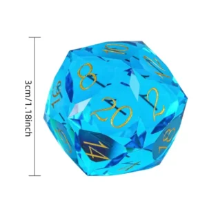 Kauliukas, kurio dydis yra 30mm, pagamintas iš permatomo, šviesaus, mėlyno stiklo, o kauliuko šonai yra apdailinti, to dėka kauliukas atrodo unikalus!