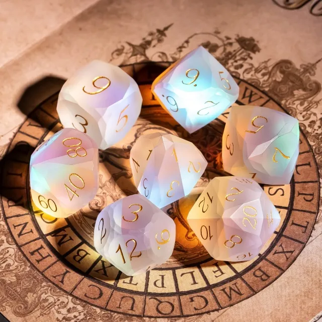 Vaivorykštės prizmės brangakmenių kauliukų rinkinys yra vienintelis toks, pagamintas brangaus vaivorykštinio krištolo šaldyto stiklo ir išgraviruotas auksinėmis raidėmis.
