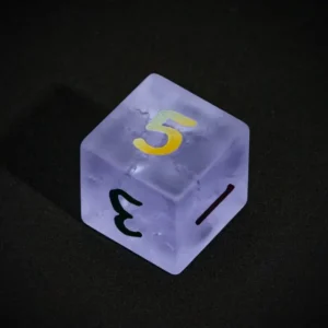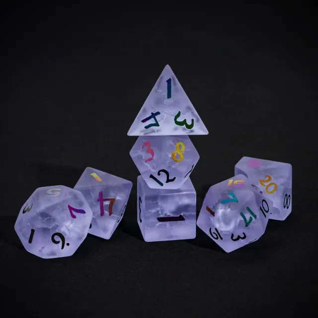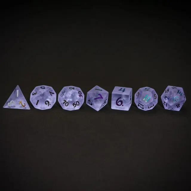 Kauliukai yra pagaminti iš matinio, purpurinio stiklo, o kiekvieno iš jų viduje, lazerių pagalba, suformuoti įtrūkimai, kurių dėka kauliukai patampa dar magiškesni! Taip pat kiekvienas kauliukas yra padabintas spalvotais, puikiai įskaitomais skaičiais.