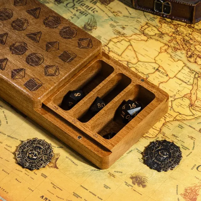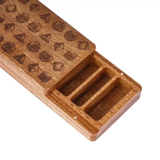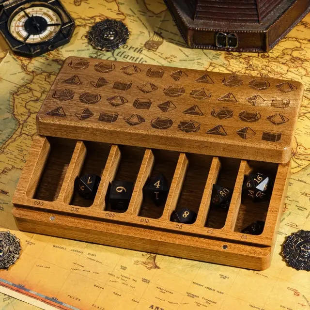 Ši kauliukams skirta dėžutė itin praktiška bei stilingas, jos paskirtis – ne tik laikyti ir transportuoti savo turimus kauliukus, kitus norimus aksesuarus, bet ir viršutinė jos dalis gali naudojama vietoj kauliukų ridenimo kilimėlio (eng. dice tray)!